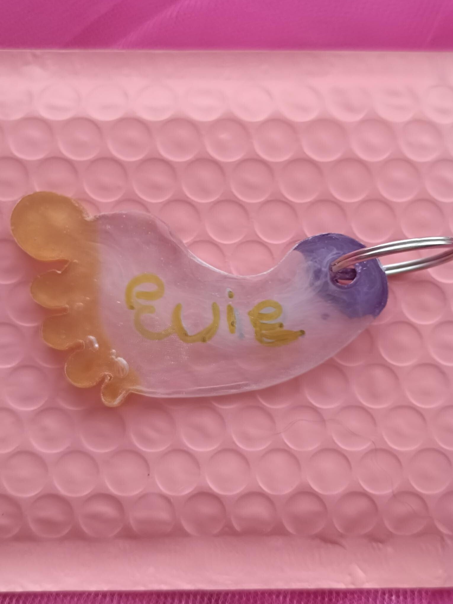 Eén van de meest geliefde ontwerpen is de sleutelhanger met een gegoten baby voetje en de naam van het kindje.